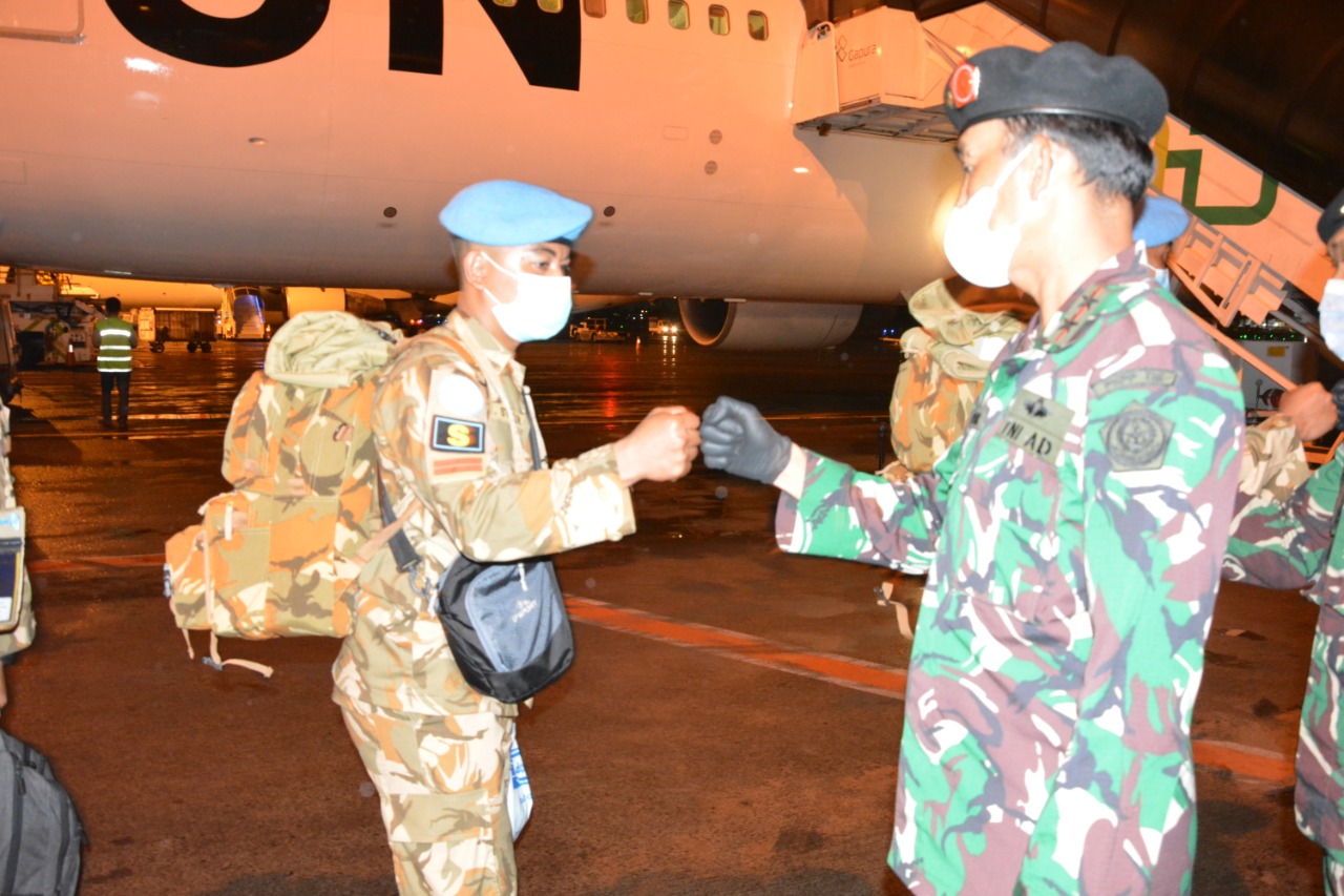 SEBANYAK 205 personel Satuan Tugas Kontingen Garuda Batalyon Gerak Cepat (BGC) Mission de l’Organisation des Nations Unies pour la stabilisation en République démocratique du Congo (Monusco) dengan pimpinan rombongan Letkol CHK Andri Wijaya tiba di Tanah Air seusai menjalankan misi perdamaian di Kongo Afrika Tengah, bertempat di Bandara Internasional Soekarno-Hatta, Cengkareng, Tangerang, Senin (18/1/2021). Sesuai Protokol Kesehatan yang ditetapkan oleh pemerintah, setibanya di Tanah Air 205 personel tersebut akan menjalani karantina di Hotel Grand Mercure Kemayoran selama 5 hari dengan pengawasan ketat dari Satgas Nasional Covid-19, sebelum kembali ke kesatuan masing-masing.[puspen TNI/sir]