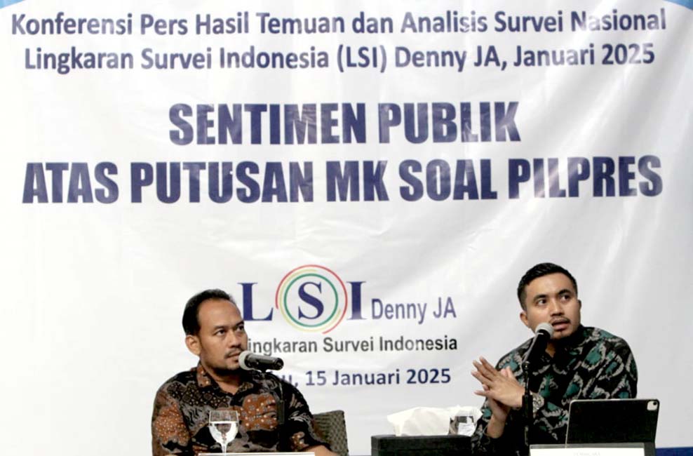 JAKARTA – Peneliti senior LSI Denny JA, Adjie Alfaraby (kanan) didampingi moderator M Khotib, memaparkan hasil temuan dan survei nasional bertema “Sentimen Publik atas Putusan MK soal Pilpres”, saat jumpa pers di Jakarta, pada Rabu (15/1/2024).