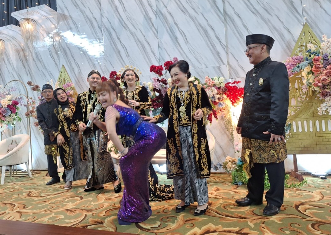 Teks foto: Irma Darmawangsa bikin heboh acara pernikahan putra ketiga dari pemilik Queen Klinik Sunter di Gedung BMKG Kemayoran, Jakarta Pusat.