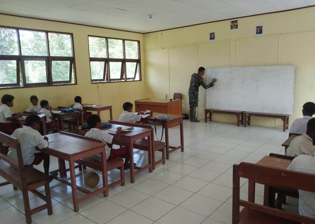 POSKOTA.CO –Personel Satgas Pamtas RI-PNG Yonif 126/KC Pos Bompay, perkuat tenaga pendidik di perbatasan Papua dengan mengajar di Sekolah SD Negeri 1 Bompay, Distrik Waris, Kabupaten Keerom.