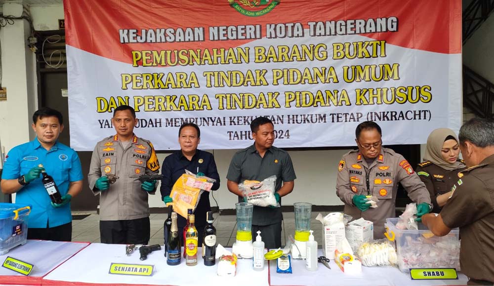 TANGERANG – Kejaksaan Negeri (Kejari) Kota Tangerang memusnahkan beragam barang bukti seperti narkotika, obat terlarang, botol miras, pistol, senjata tajam hingga uang palsu. Barang bukti tersebut dimusnahkan karena kasusnya sudah inkrah.