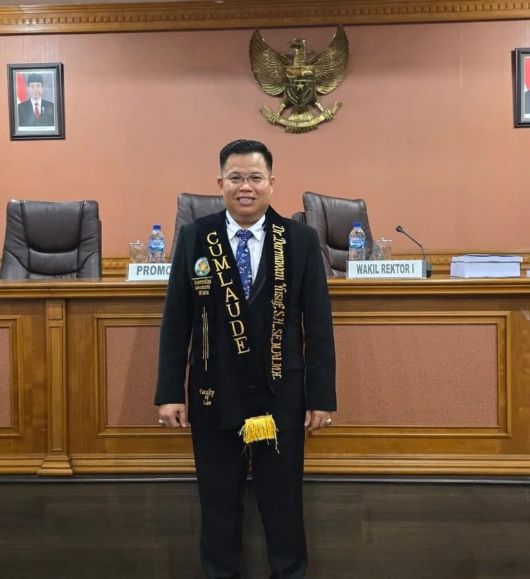 Jakarta-Pengacara kondang Dr. Darmawan Yusuf, S.H., S.E., M.Pd., M.H., CTLA, Med,. berhasil meraih gelar Doktor Ilmu Hukum dengan predikat Cumlaude dalam sidang promosi doktor yang diadakan di Gedung Biro Rektor Universitas Sumatera Utara (USU), Ruang IMT-GT., Jumat (26/4/2024)