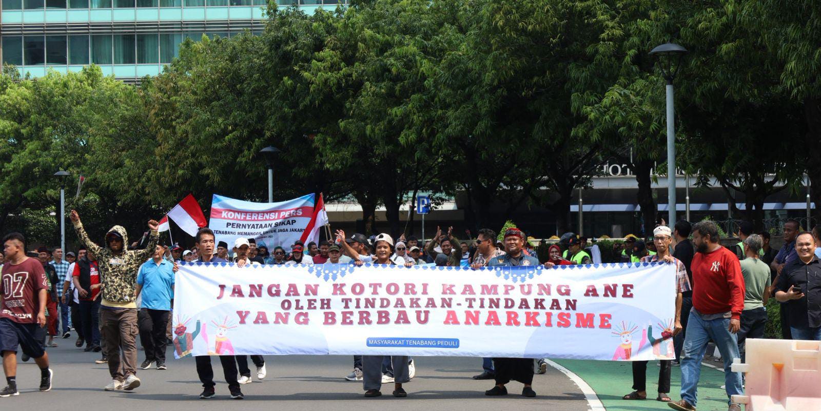 Aksi deklarasi damai yang diikuti, ratusan ormas dan warga masyarakat Tanah Abang dengan membentangkan spanduk yang bertuliskan Jangan Kotori Kampung Ane oleh Tindakan-tindakan yang Berbau Anarkisme berkumpul di kawasan bunderan Hotel Indonesia (HI) pada, Senin (1/9/2025) siang dengan menyerukan perdamaian dan bersama-sama mengutuk tindakan anarkis yang viral beberapa hari lalu.