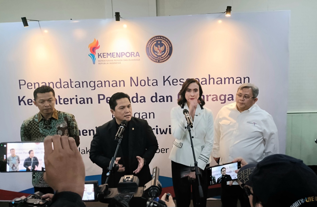 JAKARTA – Menteri Pemuda dan Olahraga (Menpora) Erick Thohir dan Menteri Pariwisata (Menpar) Widiyanti Putri Wardhana tandatangan kerjasama sama (MoU) perkuat sinergi guna menjadikan olahraga pariwisata (sport tourism) sebagai kekuatan global untuk Indonesia ke depan.