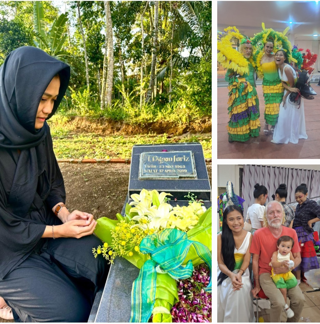 Teks foto: Foto utama Desainer Migi Rihasalay saat berziarah di makam Dynand Fariz di TPU Garahan, Jember. Foto lainnya Migi bersama suami Andrew James dan putrinya Kinikita.